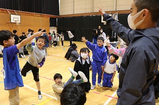 「ごろごろドカン」や「だるまさんの1日」などの遊びや「ジャンボリミッキー!」のダンスを披露し、1年生と一緒に踊りました。